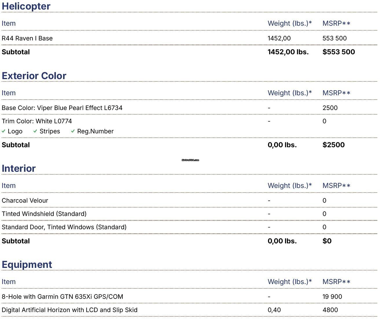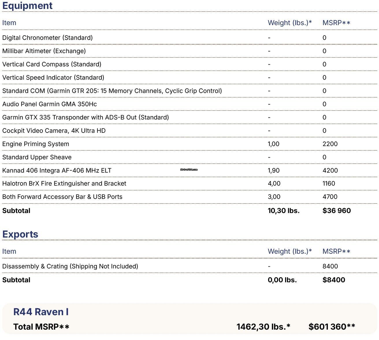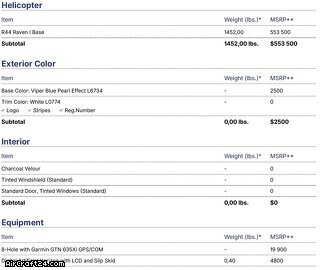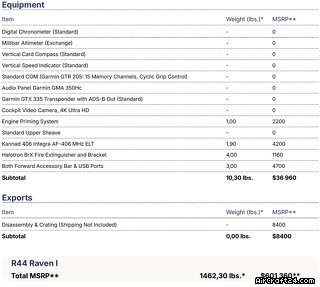 | Список альбомов | | Тип: | Вертолет (Поршневой двигатель) | | Производитель: | Robinson | | модель: | R44 | | год выпуска: | 2023 | | Регистрационный номер: | SP-HPF | | Серийный номер.: | 2731 | | местонахождение: | Польша | | Общее время (TTAF): | 1300 h | | цена: | US$ 400.000 |