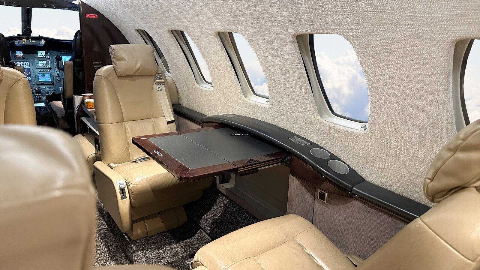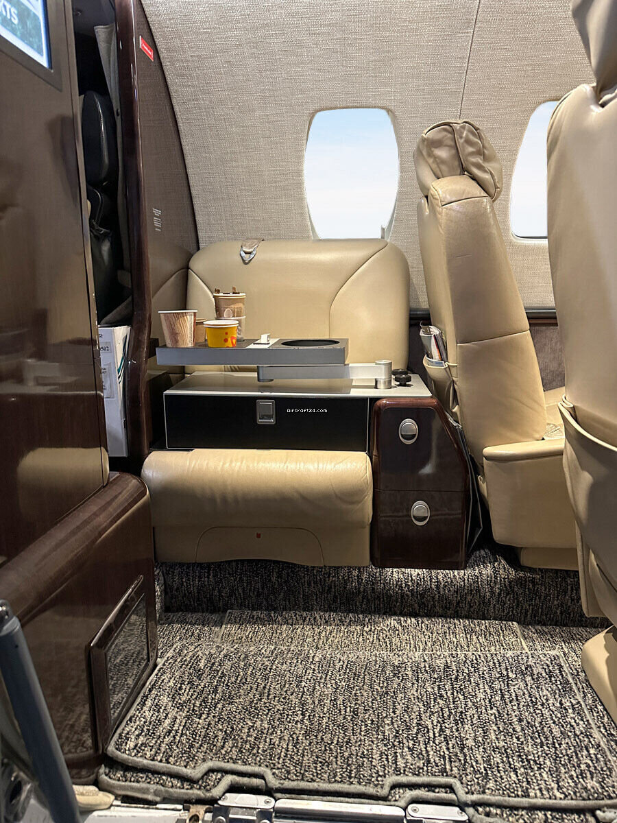 | интерьер | | Six (6) passenger executive seating in beige leather (four club seating, two single fwd. facing seats), one side facing seat (7) plus belted lav seat (8), brown carpet, brown wood veneer (gloss laminate), lavatory separated by a sliding door for privacy, slim refreshment center (hot Cup), brushed aluminum hardware, Cabin information Display (AvVisor Plus), 110 V AC Cabin and Cockpit power outlets |