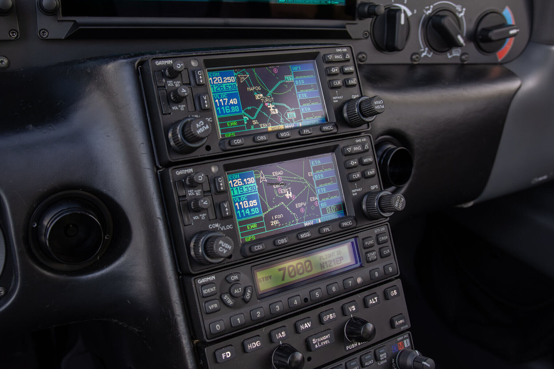 - COM/NAV/GPS: Dual Garmin GNS430W (WAAS) displaying Traffic and Stormscope.